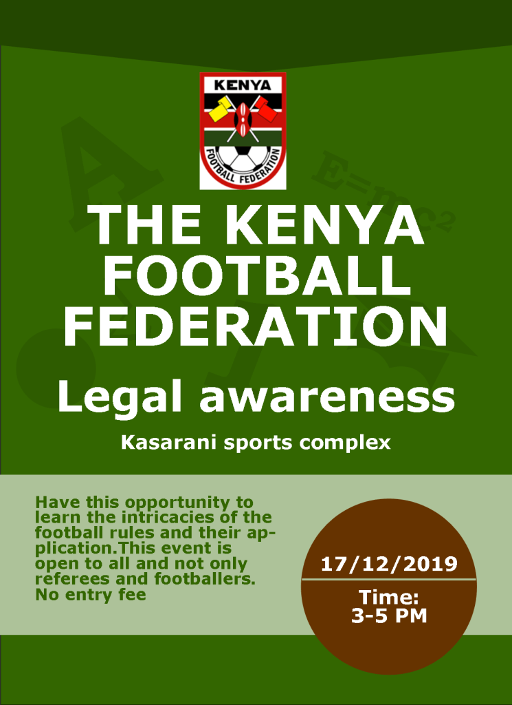 The Kenya Football federation is the body mandated by the government to manage football in Kenya.Over the time it has been accused of being corrupt especially with the enrollment of talents from Kenya to world class sports academies in Europe nevertheless they have also been accused of match fixing and colluding with betting firms to influence unduly the outcomes of football matches.Last year ,during the sweep clean of Fifa ,The Ghanaian football federation an organization similar to this one and of the same status in the country was accused of racketeering and match fixing ,Fifa has since banned the officials of the Ghanain Federation.In Kenya there were squables between the Kenya Football Federation and Football kenya over the rights of ownership of the Kenya Premier league.This poster invites all to attend this legal awareness to learn about the process of referee decision making and other laws that govern football in the country.